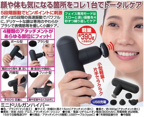 小型で持ち運びに便利なミニドリルガンハイパー。フェイスラインから首筋まで、気になる部分をしっかりとマッサージしてリフトアップ効果を実感できます。振動で筋肉をほぐし、血行促進をサポートします。コンパクトながらパワフルな力で、疲れたお肌をいつでもリフレッシュ。日中の疲れをすっきり解消しましょう。